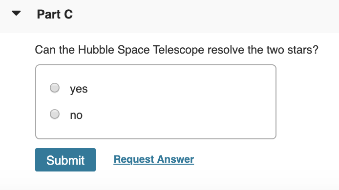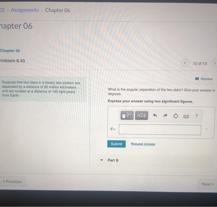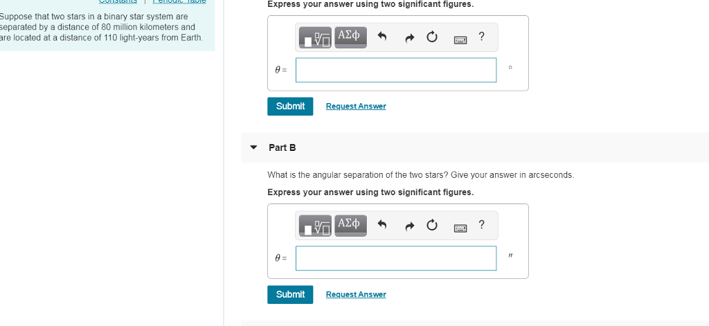 Principles With Applications Fourth Edition. Suppose that two stars in a binary star system are separated by a distance of 90 million kilometers and are located at a distance of 130 light-years from Earth. O 0 Submit Request Answer Part B What is the angular.